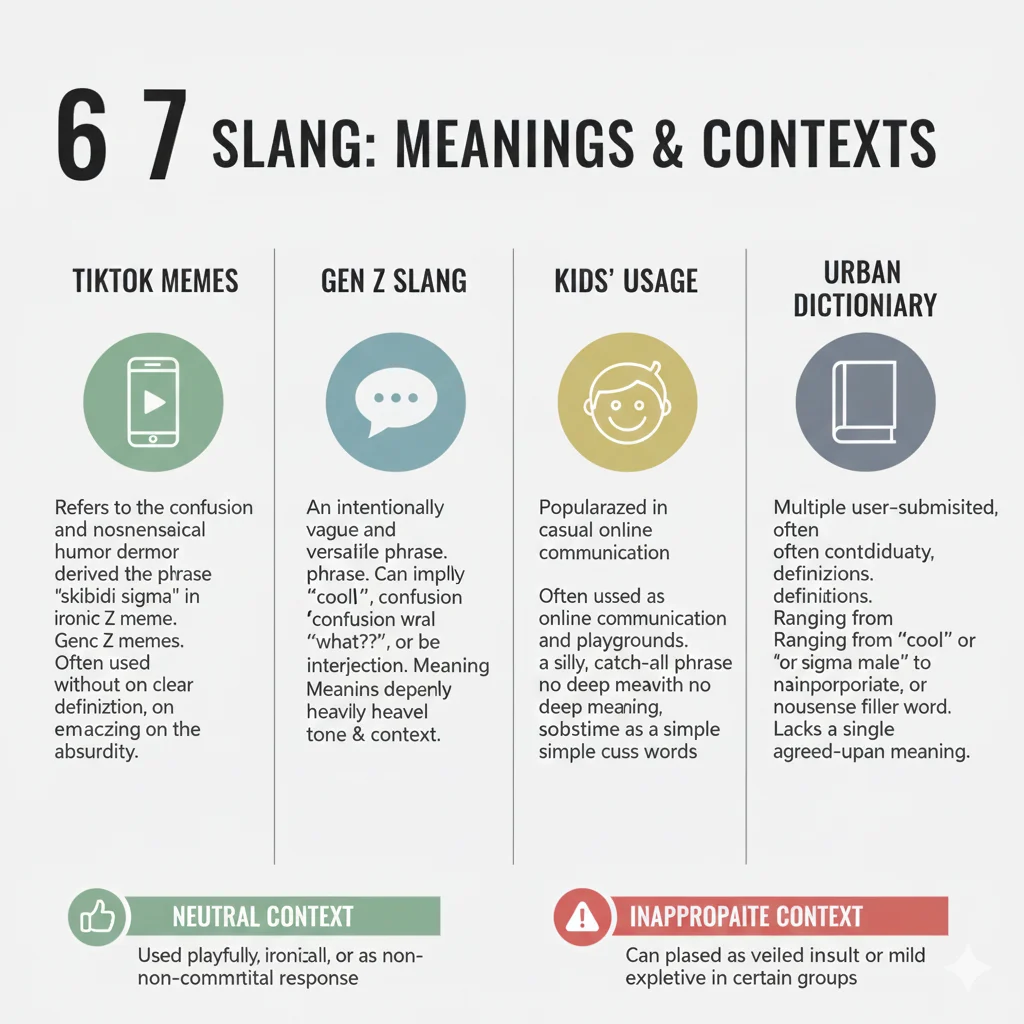 â6 7â slang is a perfect example of modern internet languageâfluid, context-based, and often intentionally confusing. In 2025, itâs used mainly on TikTok, memes, and social media, especially among Gen Z, Gen Alpha, and teens. While it can sometimes carry inappropriate undertones, most of the time itâs just trend slang with no deep meaning.